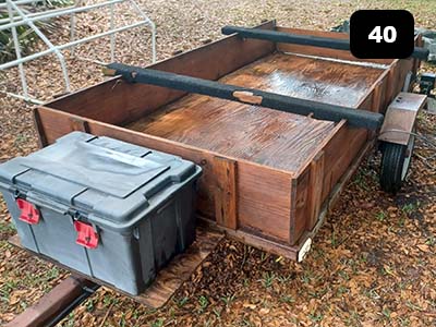 4x8 3 good tires, storage box on front, two moveable carpet racks to carry boards or kayaks, ready to paint your favorite color. collapsible PVC canopy frame to hold a tarp for camping.